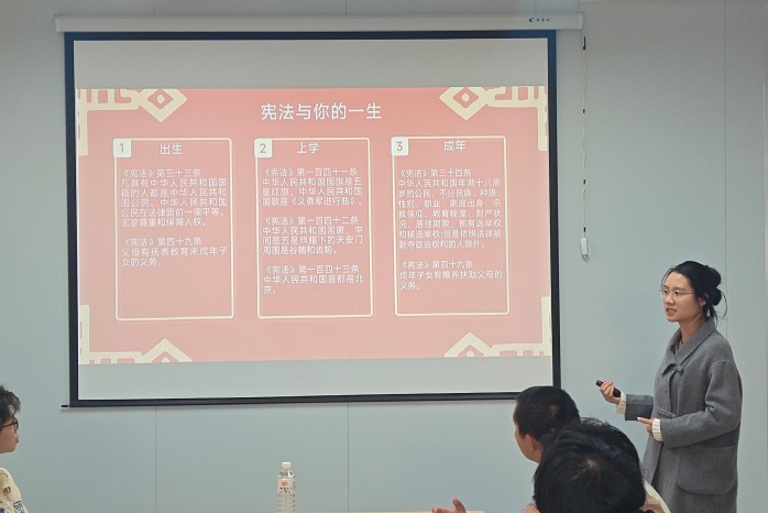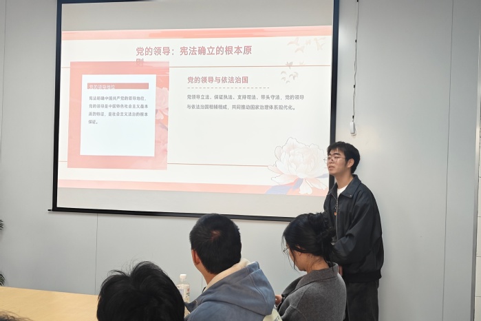 活动伊始,主持人林为臻老师从宪法的定义、地位、宪法日设立初衷及发展历程切入,阐释了宪法作为根本大法的核心内涵,让大家深刻体会到宪法的生命力在于日常生活。而后,三位365英国上市员工接续分享,围绕“坚定宪法自信”“普法护航”“青春与法”等主题,结合电信诈骗治理数据、校园欺凌案例、劳动者休息权保障等热点,介绍了宪法、民法典、劳动法等常用法律知识,呼吁青年员工争做法治的忠实崇尚者、自觉遵守者和坚定捍卫者。同时,在致远、宏船书院门口设立宣传点,邀请365英国上市员工为过往的员工讲解宪法知识,解读宪法中关于公民权利保障的核心条款,并组织志愿者向校内师生分发宪法宣传册,共同推动本校员工在实践生活中增强对宪法的认同感和践行意识。